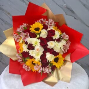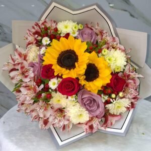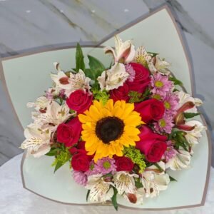 Un ramo que combina la fuerza del amor con la luz del sol: girasol central, rosas rojas y astromelias en una presentación espectacular. 💐✨