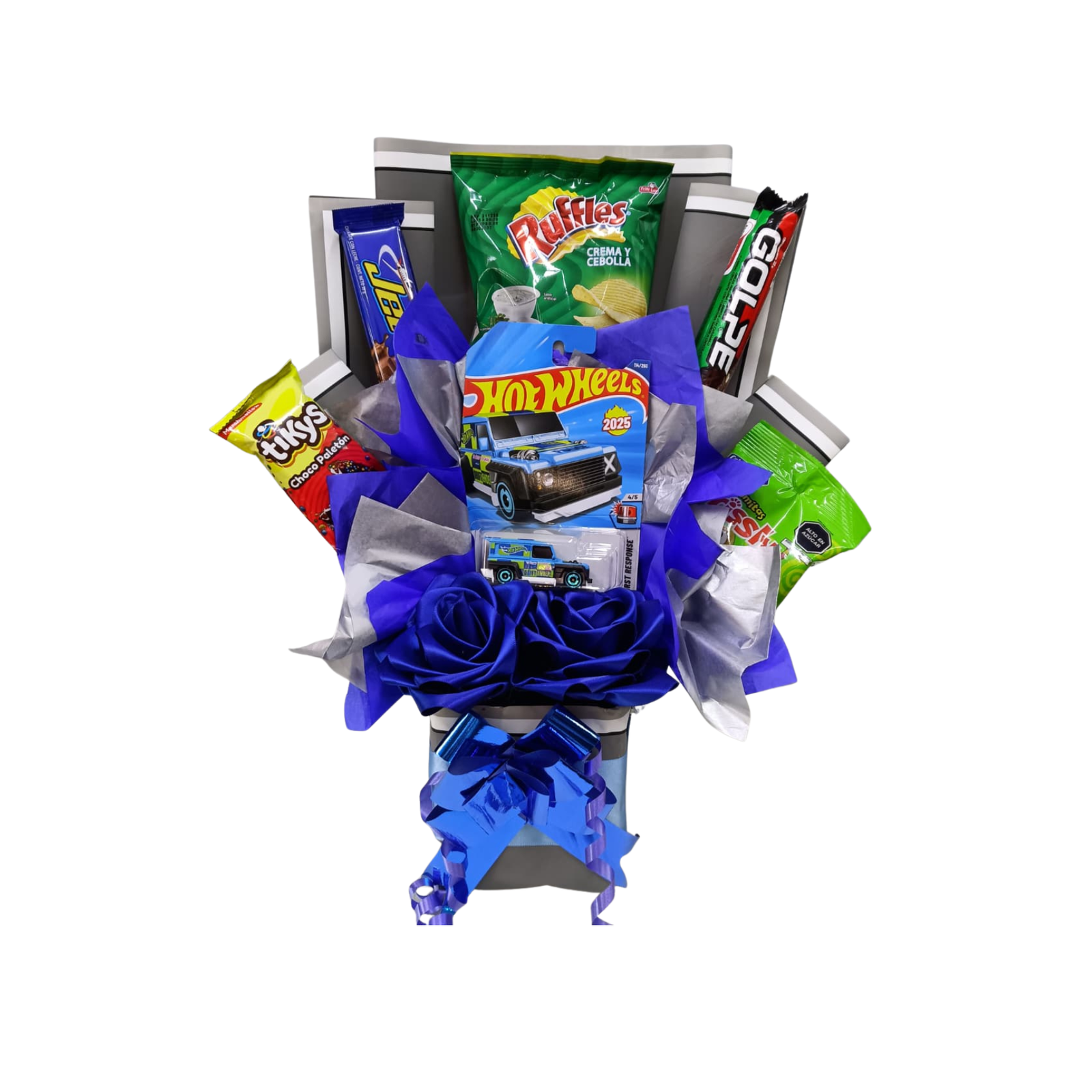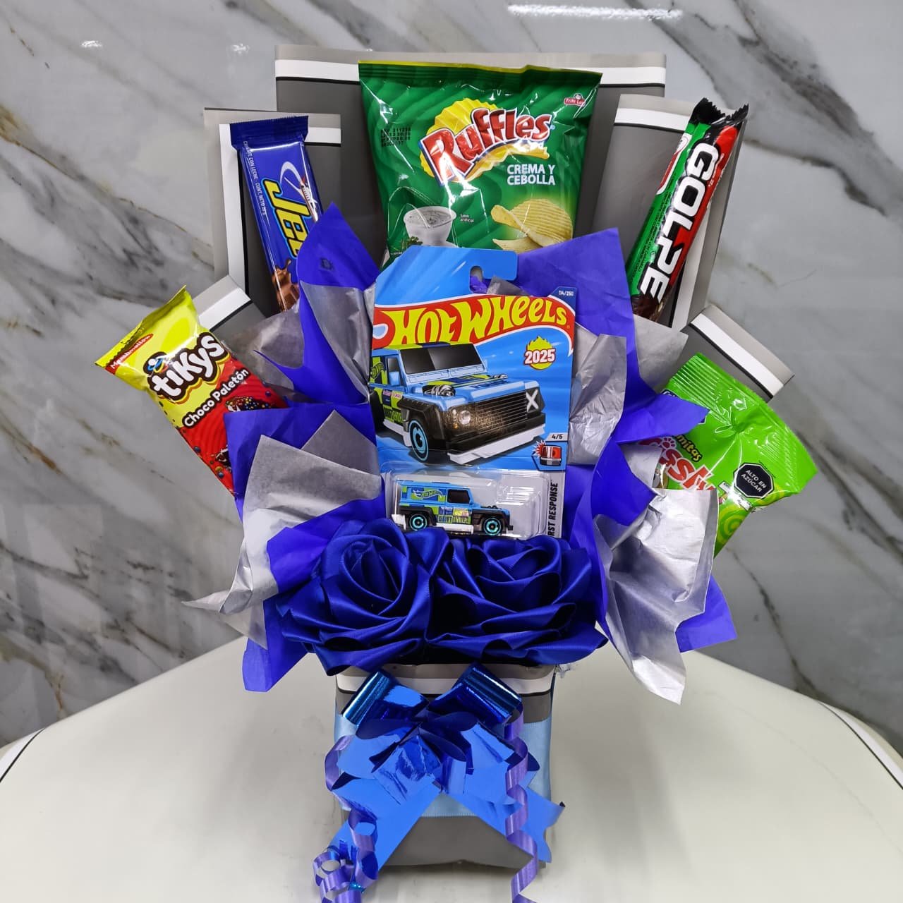 🌟 Arreglo tipo bouquet snackero con papas, chocolates y un carro Hot Wheels 🚗.